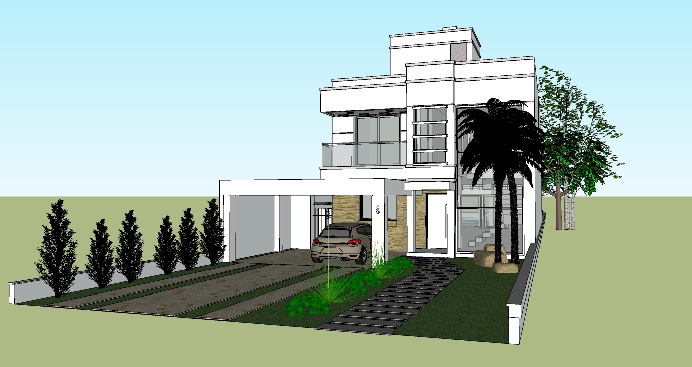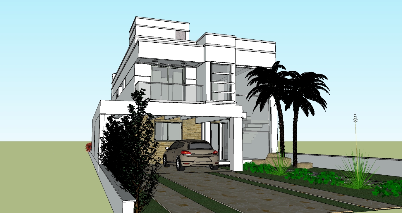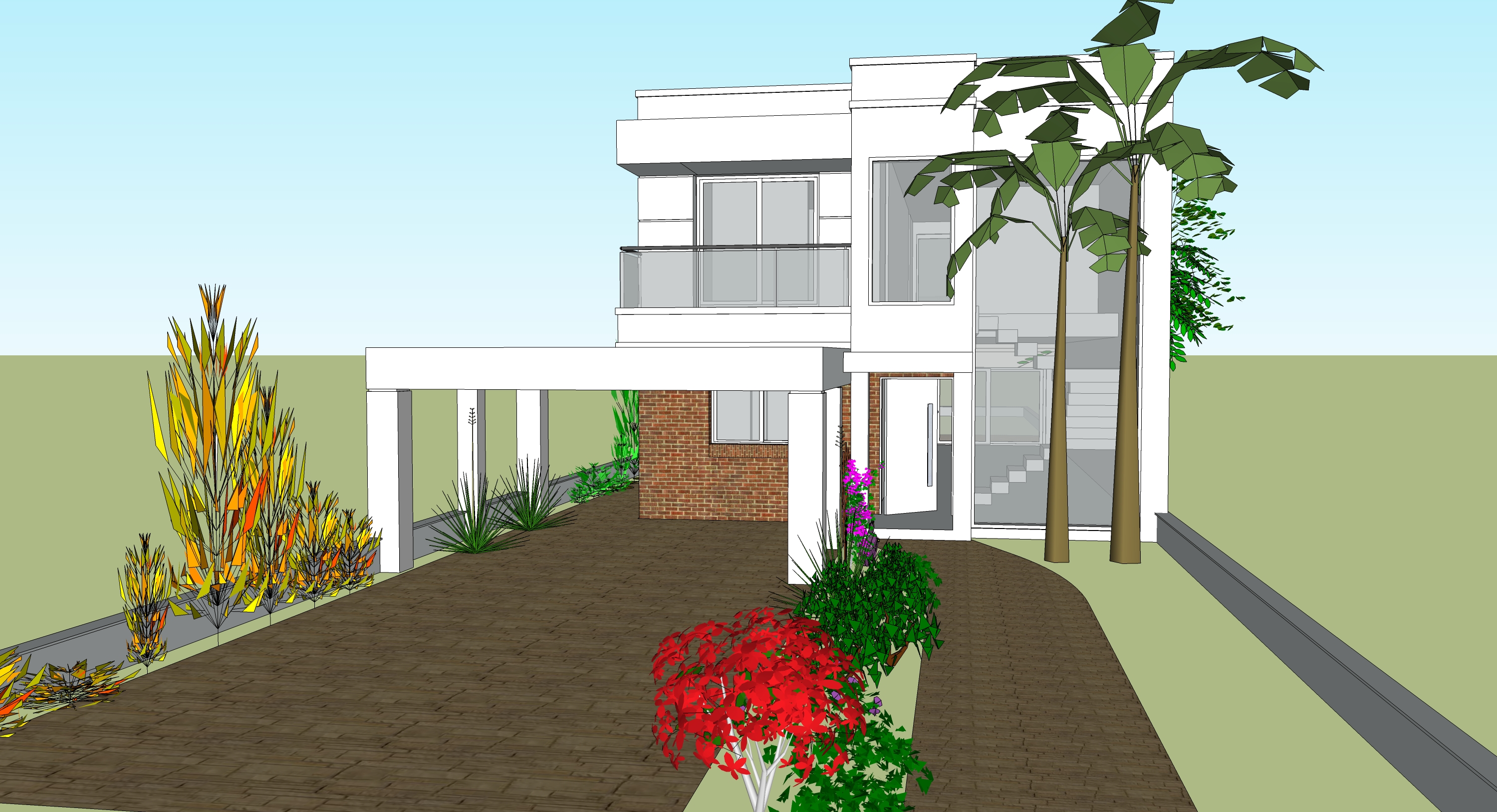 Em frente a casa, a área de estacionamento coberto e nos fundos área aberta com piscina e pergola no ambiente de estar ao ar livre.
