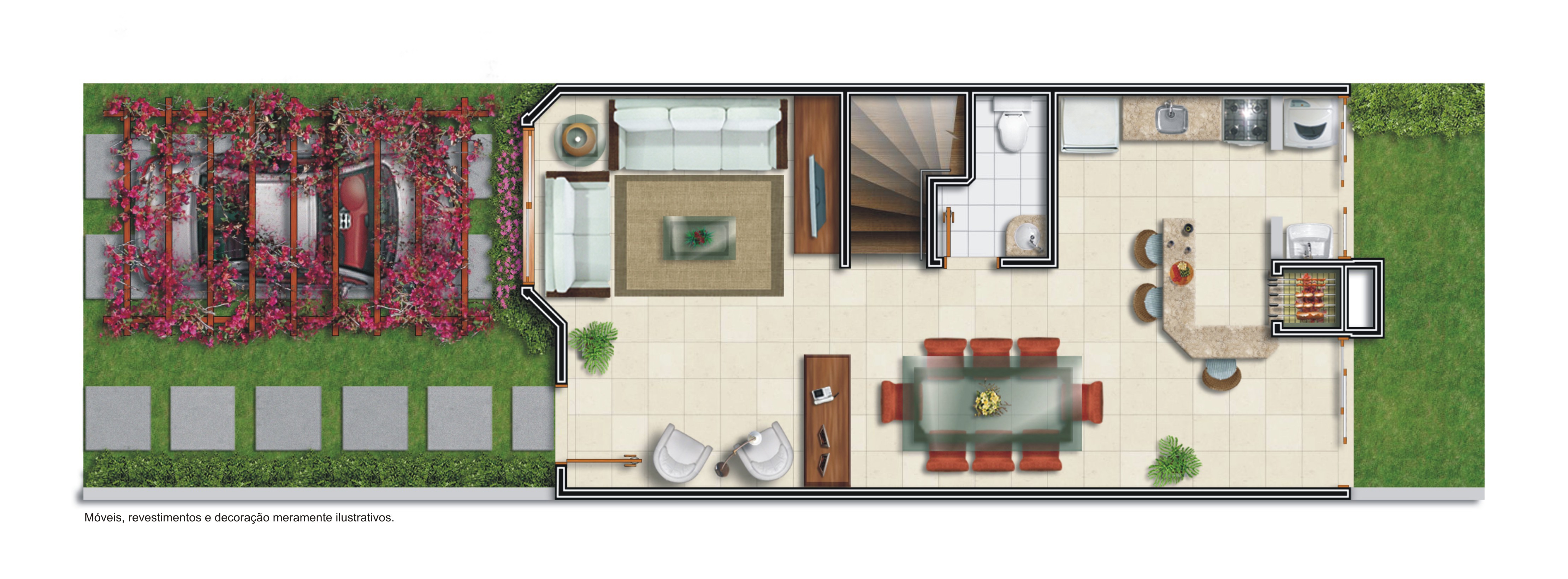 O pav. térreo é constituído de Estar/Jantar, Lavabo, Copa/Cozinha com Bar/Churrasqueira e Áreas de Serviço.