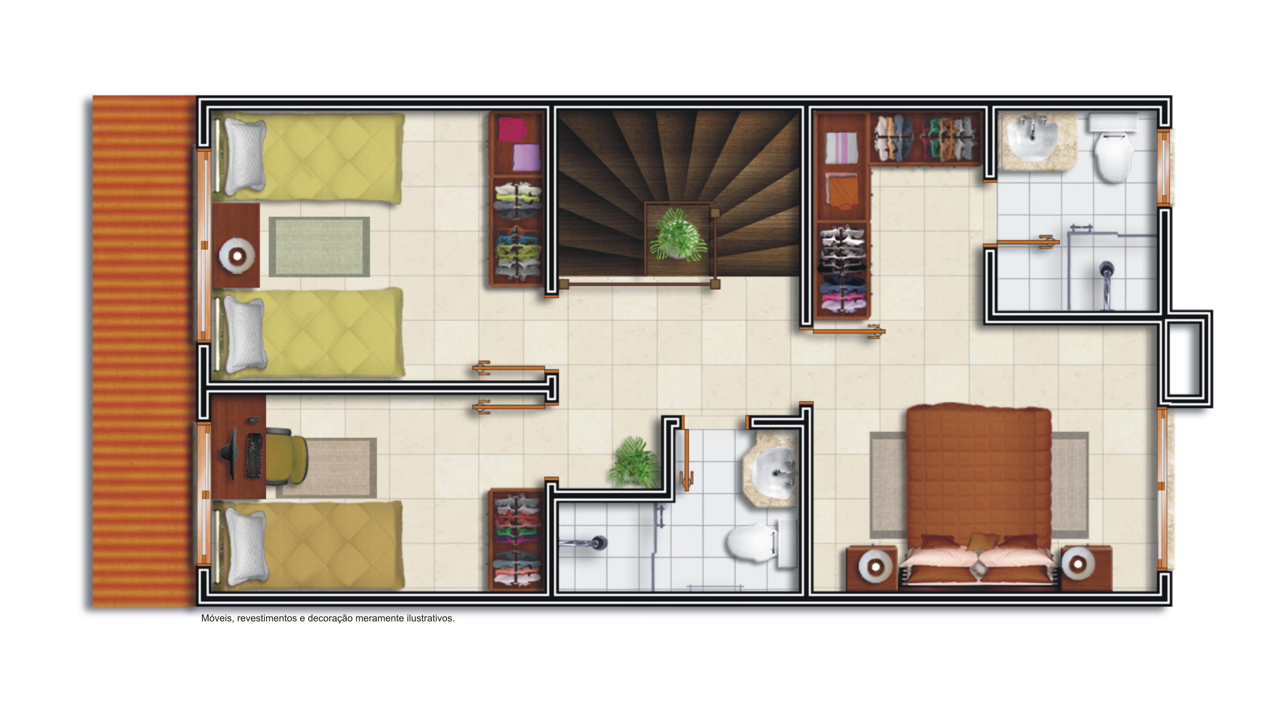 No 2º pav. foram projetados 1 suíte, 2 Dormitórios e Banho Social.