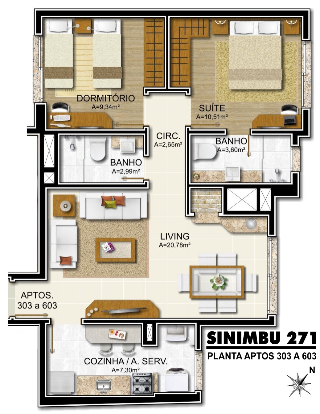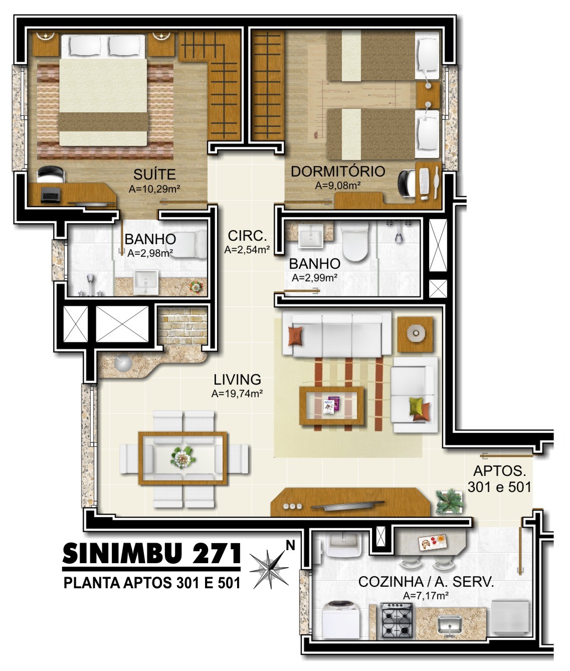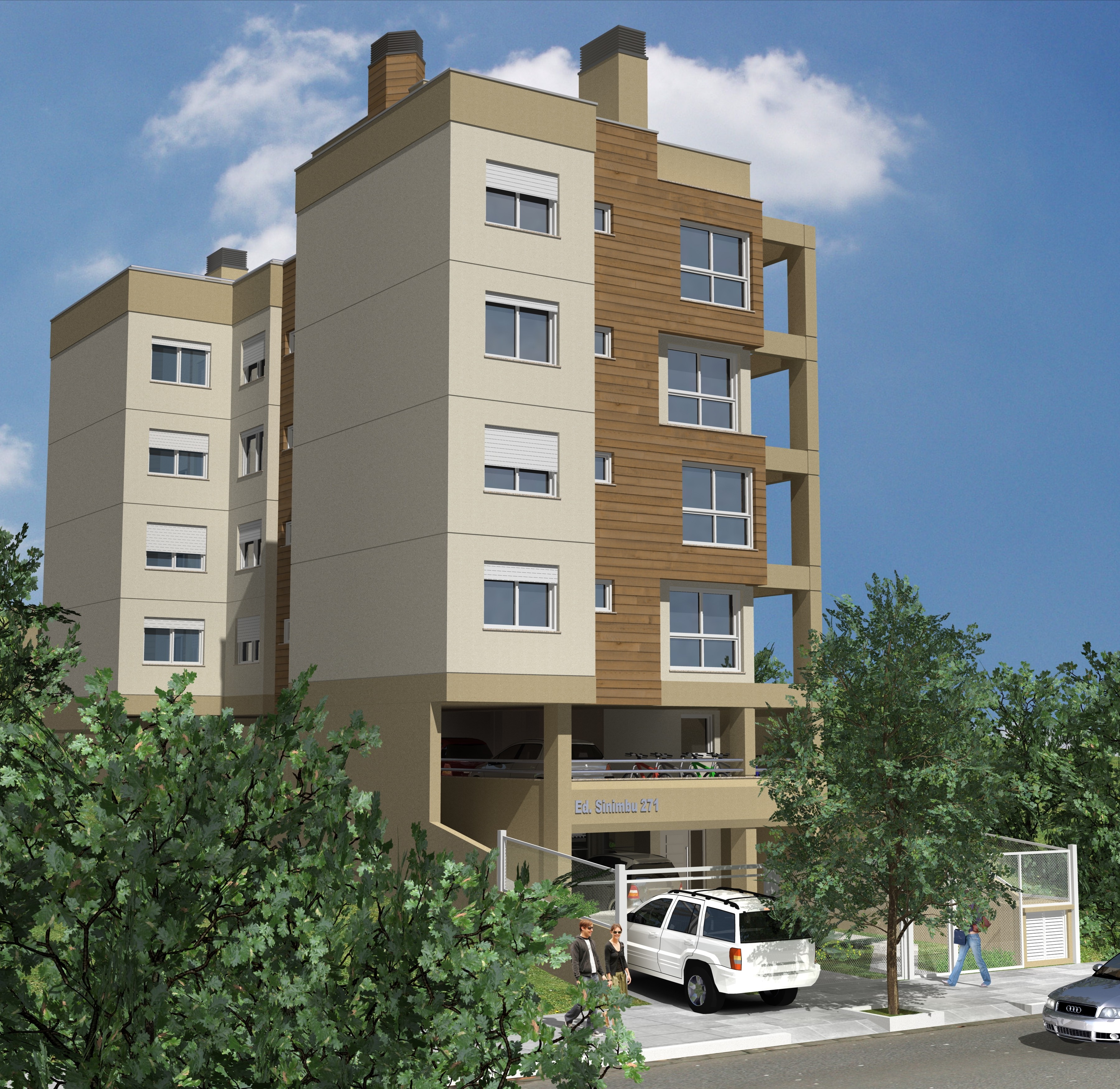 Edifício de apartamentos residenciais de 1 e 2 dormitórios, com área total de 1.380,84 m². Vagas de estacionamento e bicicletário no térreo e segundo pavimento, 4 andares de apartamentos e na cobertura terraço com área vegetada para lazer.